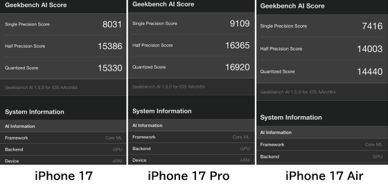 AI処理用のコア「Neural Engine」を使った場合の単精度スコアは、iPhone 17が4608、iPhone 17 Proが5113、iPhone Airが4902でした。