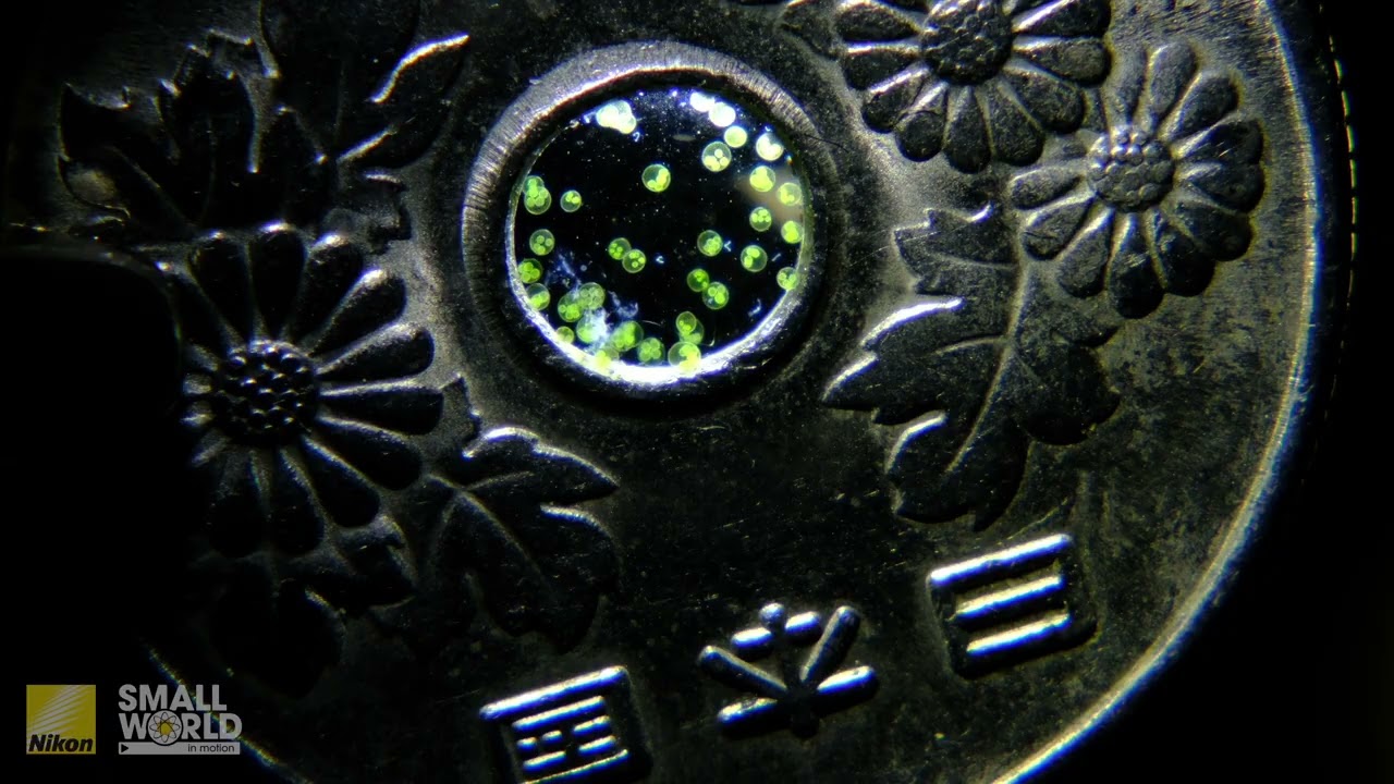 Volvox algae swimming in a water drop in a Japanese 50 Yen Coin | 2025 Nikon Small World - YouTube