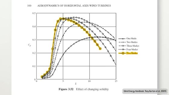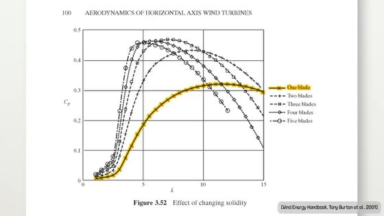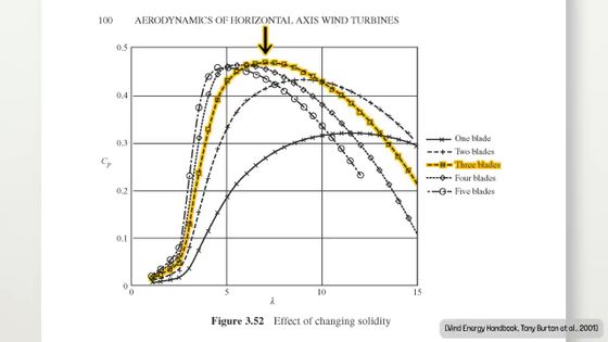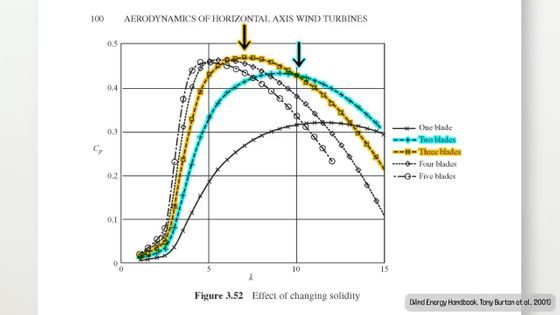 そしてブレードが3枚の場合、中間的な速度で最大限の効率が得られることがわかります。これが、タービンのブレードが3枚である物理学的な理由です。