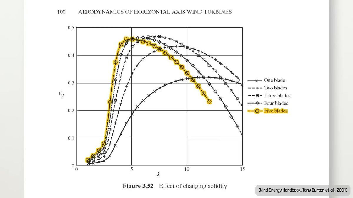 ブレード5枚のタービンは、回転速度が遅い時に効率が高くなります。