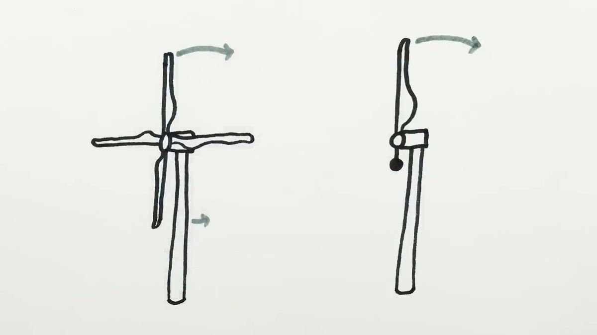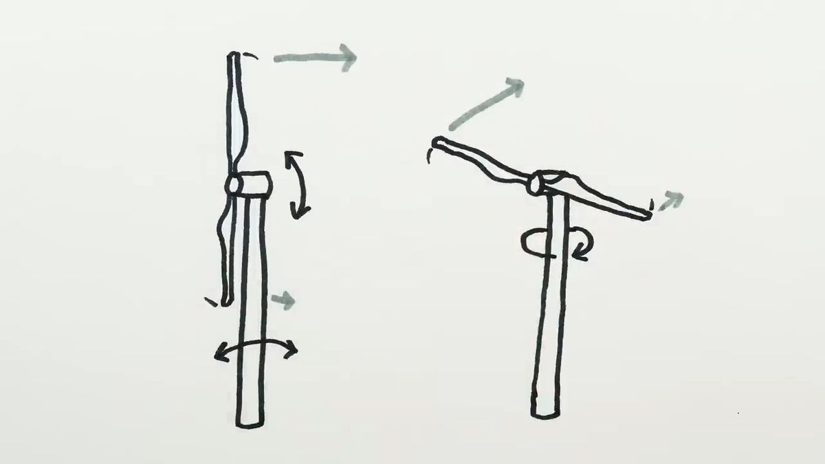 3枚ブレードのタービンは水平方向と垂直方向に占める空間割合の変化が少ない一方で、2枚ブレードのタービンは水平方向と垂直方向の間を行き来し、どこか途切れ途切れに動いているような印象を与えるとのこと。