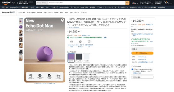 「Echo Dot Max」は各カラーともに税込1万4980円で、2025年10月29日発売予定です。