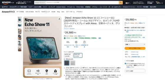 Echo Show 11は税込3万9980円で、同じく2025年11月12日発売予定です。