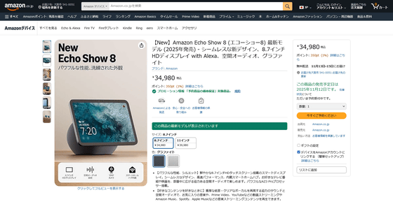 Echo Show 8は税込3万4980円で、2025年11月12日発売予定。