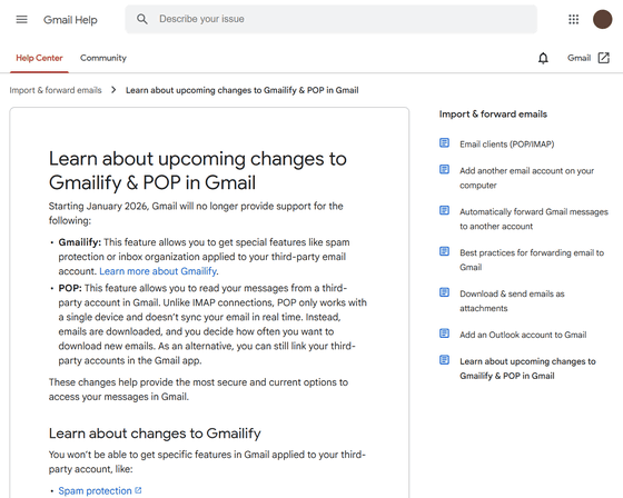 GmailでのPOPとGmailifyのサポートが2026年1月で終了、サードパーティー製POPメールを受信する機能が廃止に