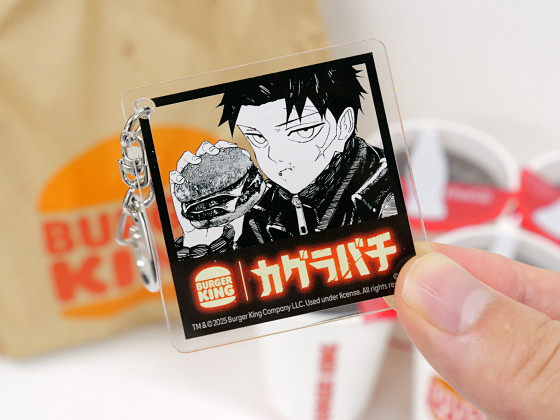 週刊少年ジャンプで連載中の人気漫画「カグラバチ」とコラボしたバーガー3種が2025年10月3日にバーガーキングに登場しました。バーガーは特製スモーキーマヨソースを使った「フレームスモーク ダブルチーズバーガー」「フレームスモーク ベーコンダブルチーズバーガー」「フレームスモーク チキンダブルチーズバーガー」の3種で、カグラバチの登場人物である「六平千鉱」「香刈緋雪」「漣伯理」のいずれかを描いたオリジナルアクリルキーホルダーも付いてきます。どんなバーガーに仕上がっているのか気になったので、実際に食べてみました。