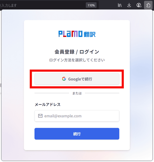 「Googleで続行」を選択して、GoogleアカウントでログインすればOK。