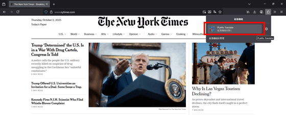 試しに、The New York Timesにアクセスしてみました。英語のページを翻訳するにはアドオンを開きます。