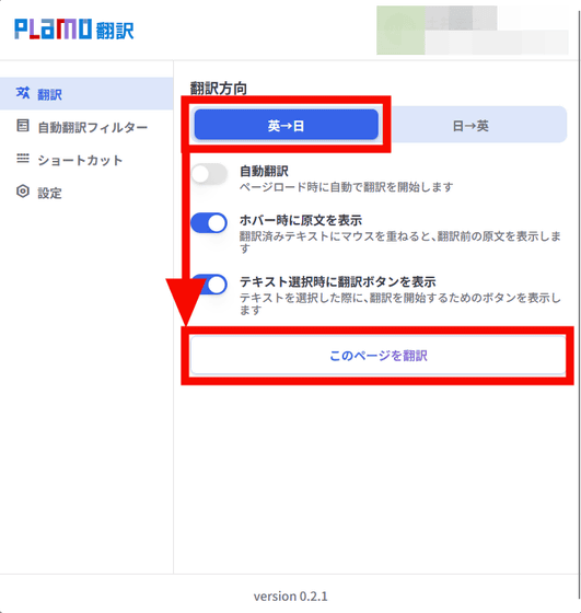 「英→日」を選択して、「このページを翻訳」をクリック。