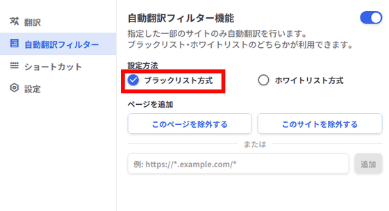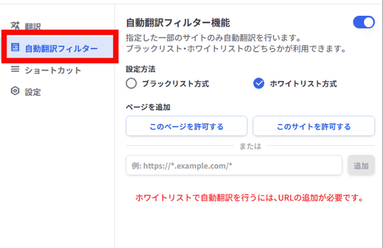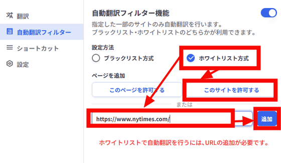 「ホワイトリスト方式」を選択したら、自動翻訳したいページを開いた状態で「このサイトを許可する」をクリック、もしくは自動翻訳するドメインを入力して「追加」をクリック。
