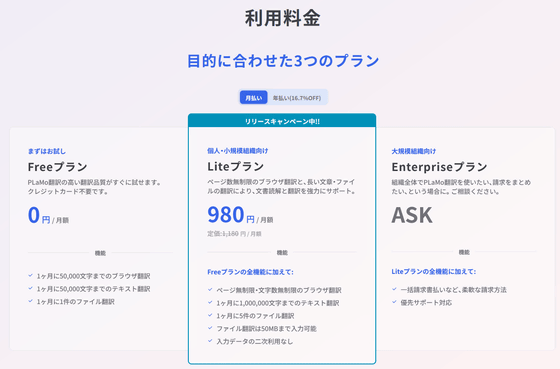 PLaMo Translateは日本語・英語の翻訳AIである「PLaMo翻訳」を使用したブラウザ拡張で、料金プランはPLaMo翻訳とまとめたものとなっています。無料で使える「Freeプラン」の場合、1カ月に5万文字までブラウザ拡張で翻訳が可能なほか、5万文字のテキスト翻訳、1カ月に1件のファイル翻訳もできます。月額980円の「Liteプラン」の場合は、ブラウザ翻訳が無制限、テキスト翻訳が月に100万文字、ファイル翻訳が1カ月に5件まで可能になります。また、年額の場合は9800円とお得になっています。詳しくはPLaMo翻訳の公式ページで確認することができます。
