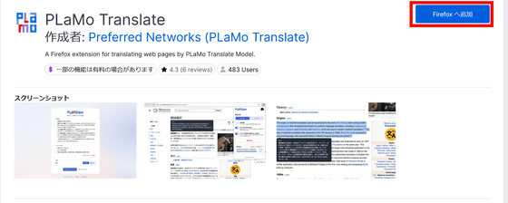 PLaMo TranslateはGoogle Chrome、Fireworkで使用できます。記事作成時点ではWindowsもしくはMacで利用可能で、Android版Firefoxで拡張機能を検索してみたところ見つけられませんでした。今回はWindows PCでFirework版を使用してみるため、アドオン配布ページにアクセスして「Firefoxへ追加」をクリック。