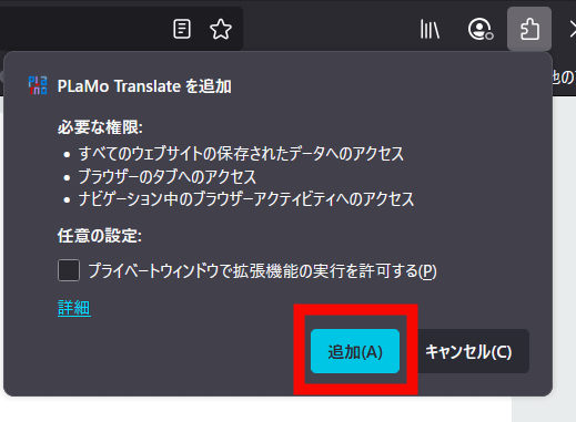 ツールバーのアドオンパネルにポップアップが表示されたので、「追加」をクリックします。