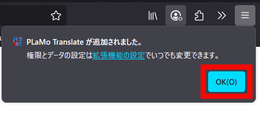 「PLaMo Translateが追加されました」と表示されたら完了。「OK」をクリックします。