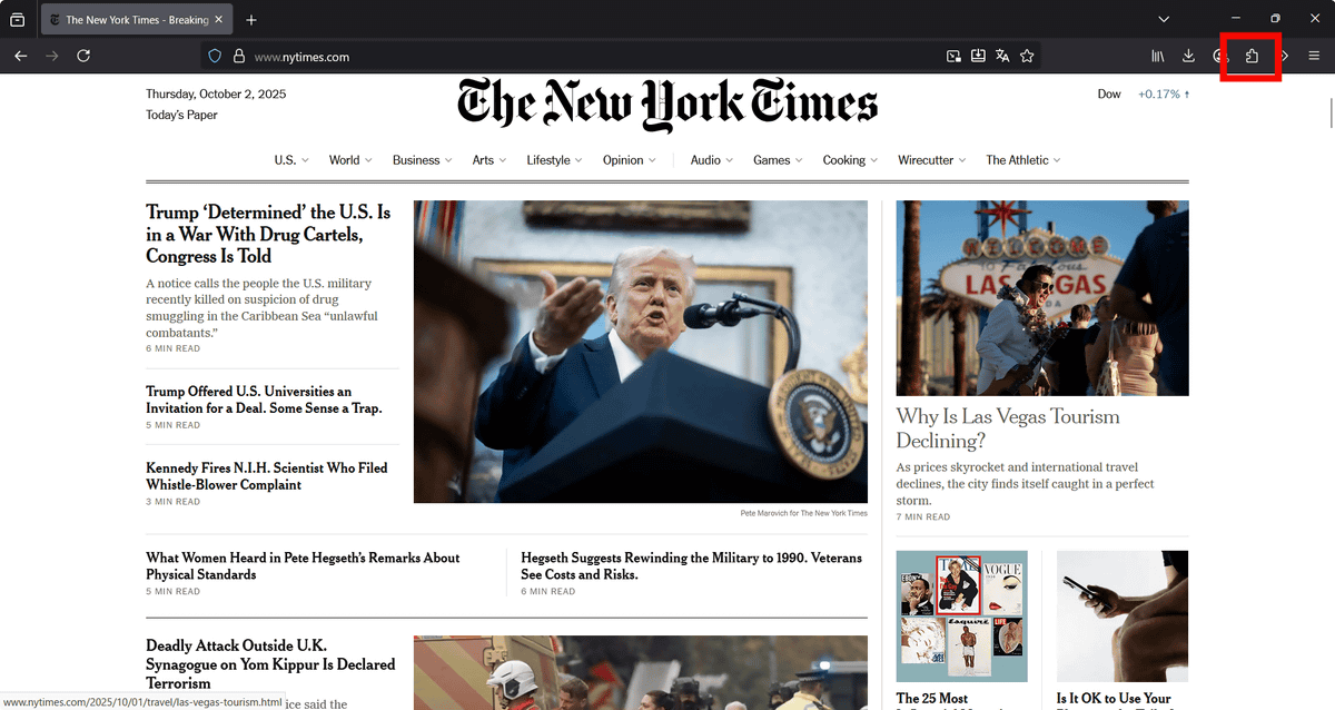 試しに、The New York Timesにアクセスしてみました。英語のページを翻訳するにはアドオンを開きます。