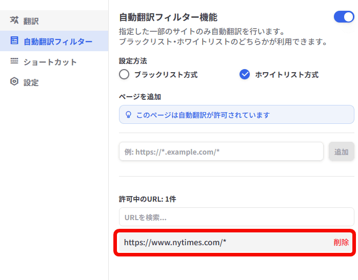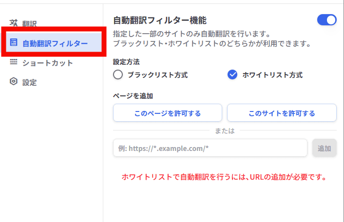 「ホワイトリスト方式」を選択したら、自動翻訳したいページを開いた状態で「このサイトを許可する」をクリック、もしくは自動翻訳するドメインを入力して「追加」をクリック。