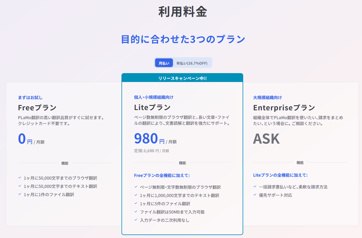 PLaMo Translateは日本語・英語の翻訳AIである「PLaMo翻訳」を使用したブラウザ拡張で、料金プランはPLaMo翻訳とまとめたものとなっています。無料で使える「Freeプラン」の場合、1カ月に5万文字までブラウザ拡張で翻訳が可能なほか、5万文字のテキスト翻訳、1カ月に1件のファイル翻訳もできます。月額980円の「Liteプラン」の場合は、ブラウザ翻訳が無制限、テキスト翻訳が月に100万文字、ファイル翻訳が1カ月に5件まで可能になります。また、年額の場合は9800円とお得になっています。詳しくはPLaMo翻訳の公式ページで確認することができます。