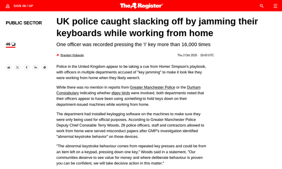 イギリスの複数の警察で、在宅勤務を許可されている警察官や職員らが、実際は勤務していないのに勤務しているかのように見せかける「キージャミング」を行っていたことが指摘されています。ダラム警察の事例では「I」キーが1万6000回以上押されていた記録があり、当人は辞職しています。