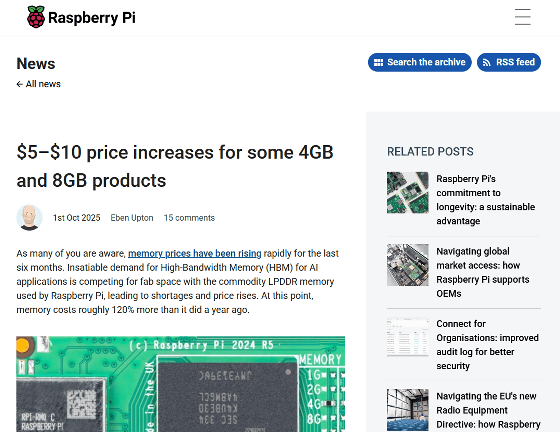 HBMは主にAIチップなどに採用されているため、一般消費者に対する影響は少ないように思えます。しかし、実際は「半導体製造工場の生産能力がHBMの製造に費やされ、一般消費者が必要としているDRAMなどの製造ラインが圧迫される」という問題が存在しています。すでにRaspberry Piはメモリの供給不足を原因に「Raspberry Pi Compute Module 5(CM5)」や「Raspberry Pi 500」といった製品の値上げを発表しています。