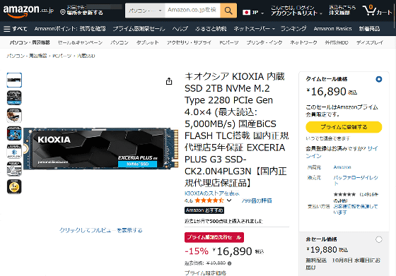 記事作成時点では高速かつ大容量なSSDでも比較的安価な価格で入手可能です。例えば、国産フラッシュメモリを採用したキオクシアのPCIe 4.0対応SSD「EXCERIA PLUS G3」の場合、2TBモデルでも2万円を切る価格で販売されており、セールを狙えば1万7000円を切る非常に安い値段で入手可能です。