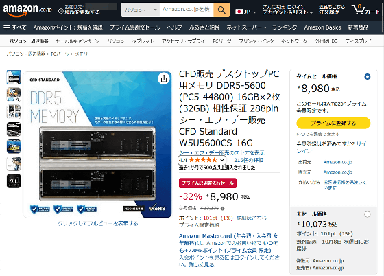 また、メモリもかなり安くなっていて、「DDR5-5600規格で16GB×2枚組(合計32GB)」というスペックでもセールを活用すれば9000円以下で入手できます。