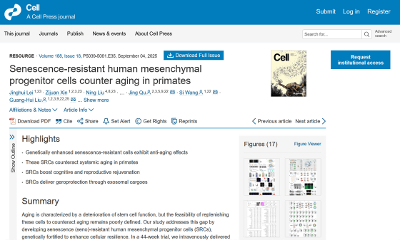 実験では19~23歳のカニクイザル(ヒトの約57~69歳に相当)を「生理食塩水を投与するグループ」「普通の幹細胞を投与するグループ」「SRCを投与するグループ」に分け、44週間にわたって2週間ごとに投与を実施しました。なお、注入に関しては免疫の拒絶反応や腫瘍の増加といった重篤な有害事象はみられなかったとのこと。