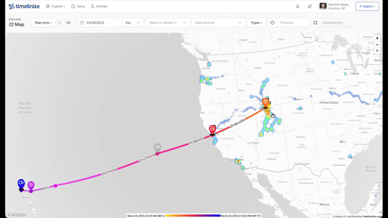 Timelinizeはエンティティを認識するため、テキストメッセージや電子メールなど座標を持たないデータでも、ポイントがいつどこで発生したかを地図上に視覚化します。あるエンティティについて、他のデータポイントとほぼ同時期に地理位置情報が特定されたポイントが存在する場合も、地図上に表示されます。