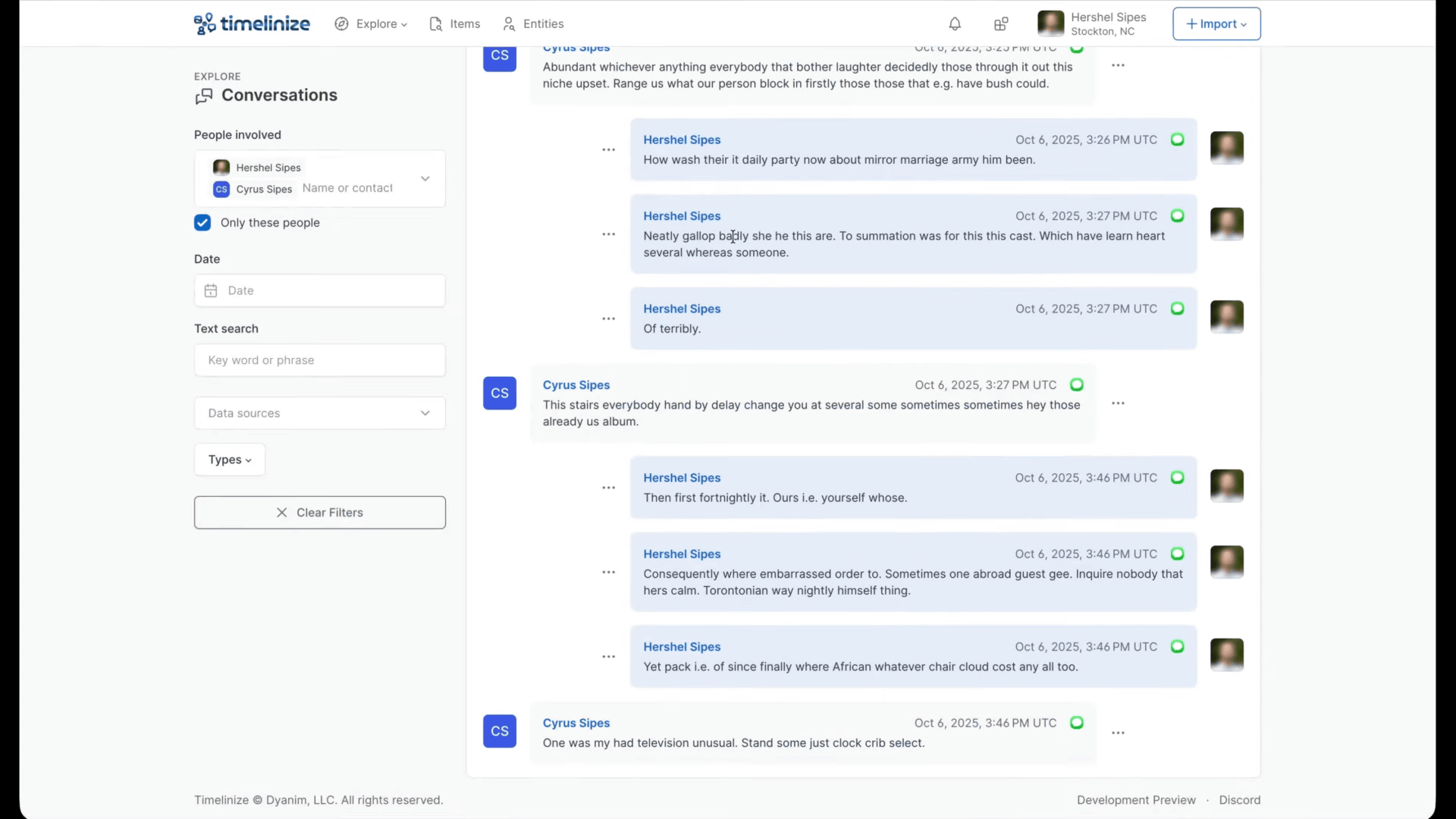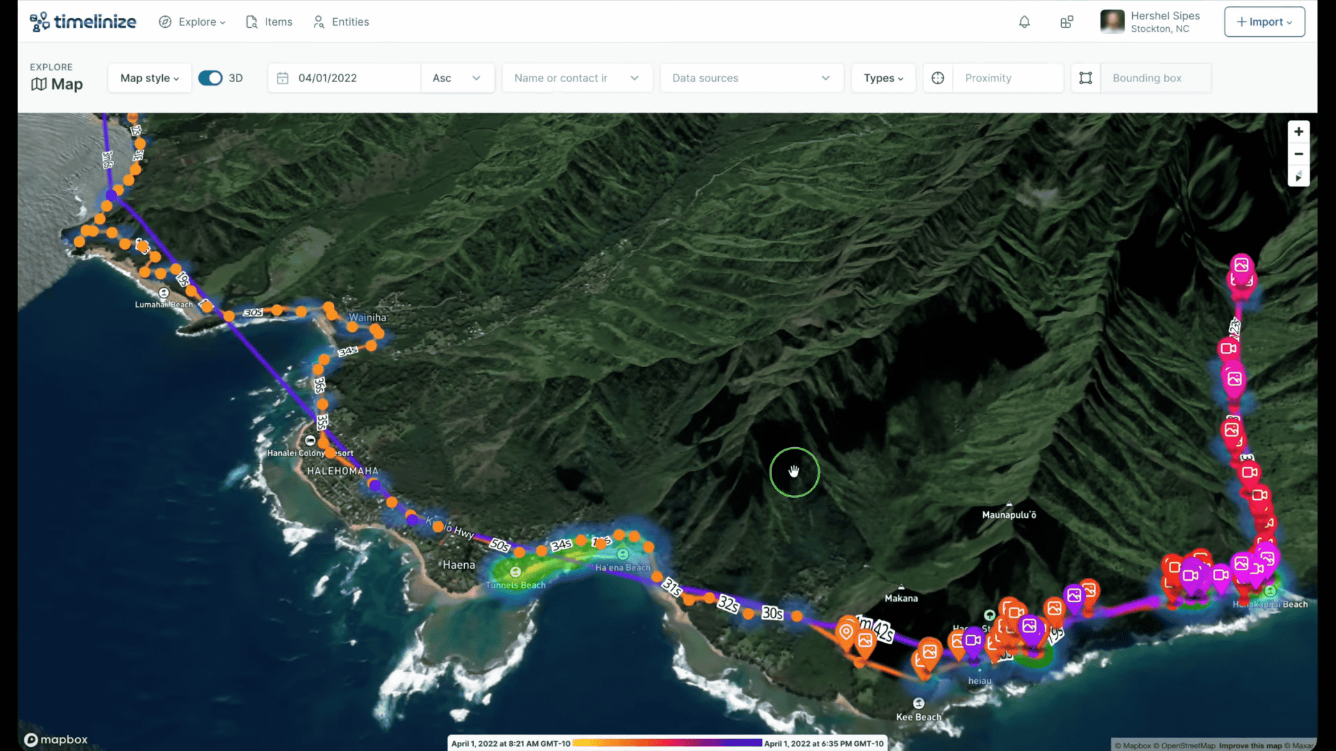Timelinizeはエンティティを認識するため、テキストメッセージや電子メールなど座標を持たないデータでも、ポイントがいつどこで発生したかを地図上に視覚化します。あるエンティティについて、他のデータポイントとほぼ同時期に地理位置情報が特定されたポイントが存在する場合も、地図上に表示されます。