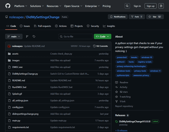 このようなユーザーに無断で行われる設定変更を追跡できるように設計されたPythonスクリプトが「DidMySettingsChange」というわけ。DidMySettingsChangeを起動すると、Windowsのプライバシー設定およびテレメトリ設定が自動でスキャンされ、テキストファイル形式で保存されます。Windows Updateを実行した後にDidMySettingsChangeを実行することで、DidMySettingsChangeが変更された設定がないかチェックしてくれるというわけ。