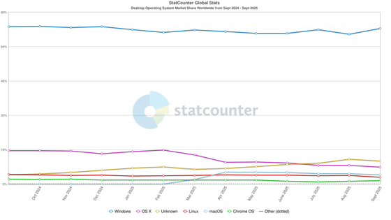ウェブトラッキング解析サイトのStatCounterによると、2025年9月時点でのPC向けOSにおけるWindows(青線)のシェアは72.39%を記録しています。