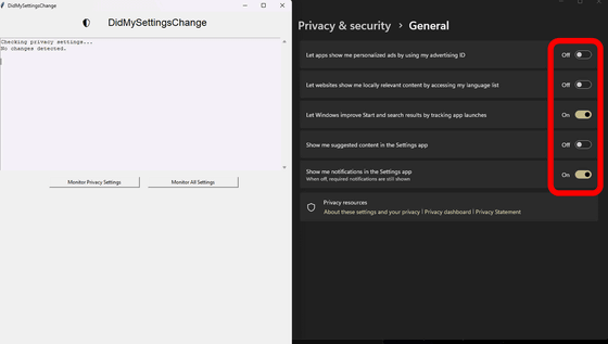 以下のスクリーンショットは、画面右にWindowsの設定内にある「プライバシーとセキュリティ」の「推奨事項&オファー」画面で設定できる項目を表示しており、画面左にはDidMySettingsChangeが表示されています。「推奨事項&オファー」画面の各設定を、赤枠部分の通りに設定し、DidMySettingsChangeでこれらの設定を記録。