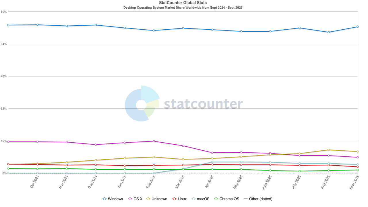 ウェブトラッキング解析サイトのStatCounterによると、2025年9月時点でのPC向けOSにおけるWindows(青線)のシェアは72.39%を記録しています。