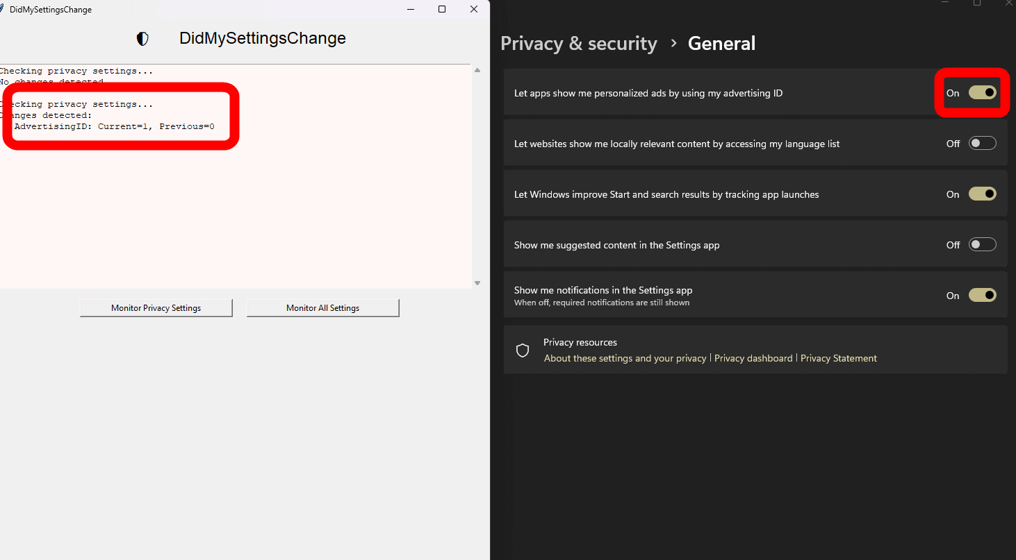 以下のスクリーンショットは、画面右にWindowsの設定内にある「プライバシーとセキュリティ」の「推奨事項&オファー」画面で設定できる項目を表示しており、画面左にはDidMySettingsChangeが表示されています。「推奨事項&オファー」画面の各設定を、赤枠部分の通りに設定し、DidMySettingsChangeでこれらの設定を記録。