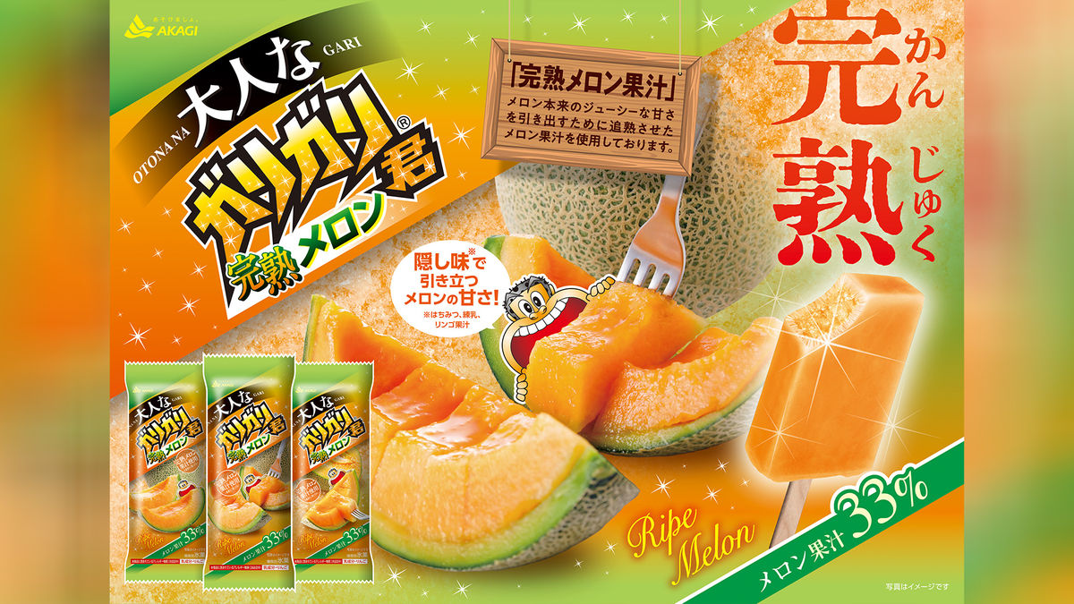 2025年10月14日(火)、メロンアイスの中にメロンかき氷を入れたアイスキャンディ「大人なガリガリ君完熟メロン」が登場します。メロン果汁を33%を使用し、さらに隠し味として「はちみつ」「練乳」「リンゴ果汁」を含めることで、メロンの甘さをさらにおいしく引き出しているとのこと。希望小売価格は税込151円です。