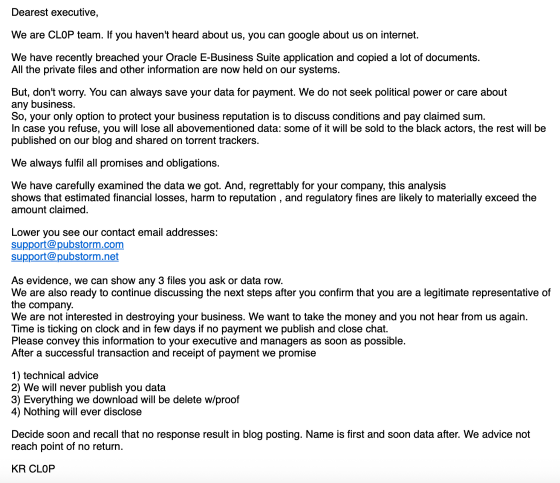 さらに、CL0Pのウェブサイトにも被害を受けた組織に対して取引を要求するメッセージが掲載されています。これらのメッセージには取引方法やデータ漏えいを防ぐために必要な金額は明記されていません。Googleによると取引内容の詳細を明かさないのは攻撃者にとって一般的な手法であり、「交渉権限を持った人物」からの連絡を受けたあとに詳細が示されるそうです。