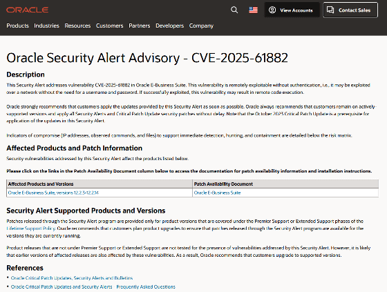 今回の攻撃はEBSに存在していたゼロデイ脆弱性「CVE-2025-61882」を悪用したものであり、2025年7月頃から攻撃が始まっていたとのこと。GoogleはEBSを利用する組織に対して2025年10月4日にリリースされた緊急パッチを速やかに適用するように求めています。