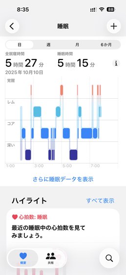 同時にApple Watch Ultra 2を着けて測定した結果が以下。当然ながら、睡眠深度のデータも含めて、測定結果はほぼ同じ。