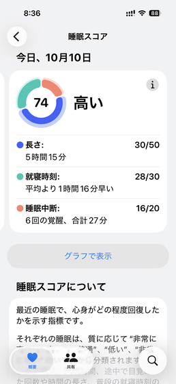 睡眠スコアは総合点で、100点満点で示されます。ただし、スコア配分はわからず。