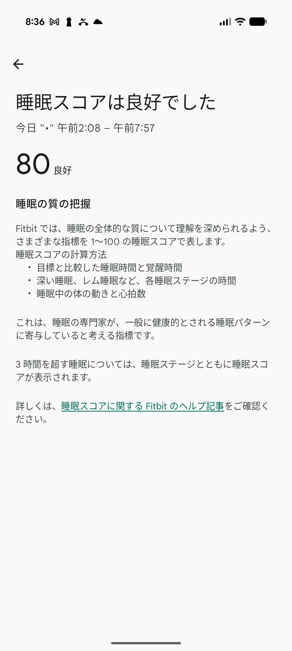 睡眠スコアは総合点で、100点満点で示されます。ただし、スコア配分はわからず。