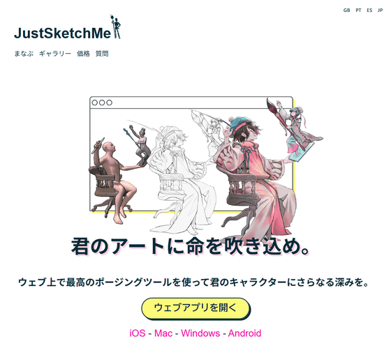 JustSketchMeにはiOS・macOS・Windows・Android向けアプリも用意されていますが、ブラウザ上から使用することもできるので、今回はウェブアプリを使ってみます。JustSketchMeにアクセスして「ウェブアプリを開く」をクリック。