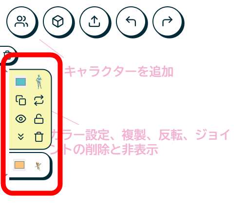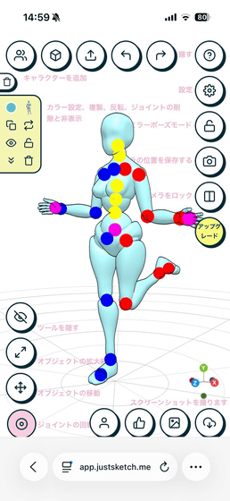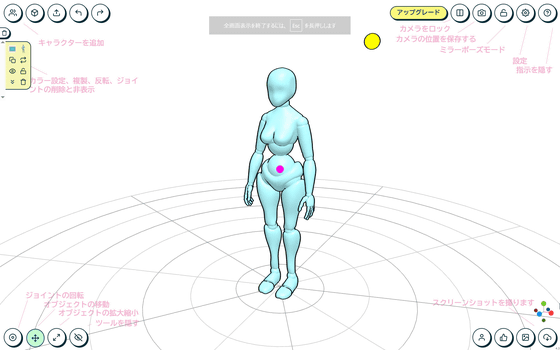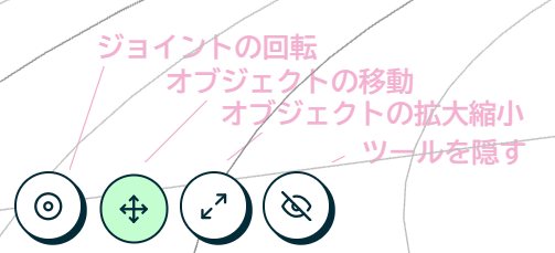 画面左下にある4つのツールは、左から「ジョイントの回転」「オブジェクトの移動」「オブジェクトの拡大縮小」「ツールを隠す」です。3Dモデルのポージングを変更するには、「ジョイントの回転」をクリック。