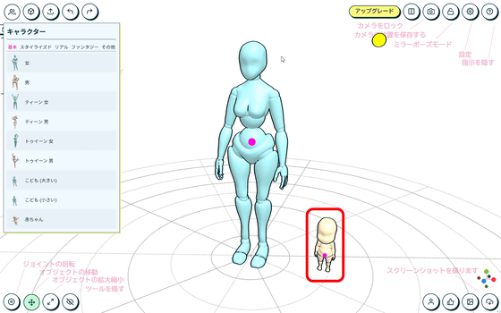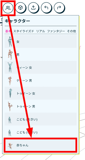 画面左上にある人型アイコンから、3Dモデルを追加することが可能。試しに「赤ちゃん」を選択。