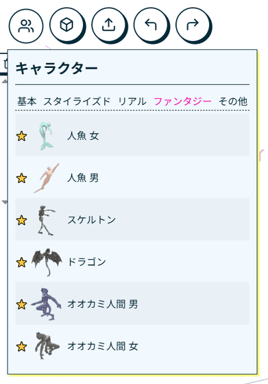 追加できる3Dモデルには既にポージングを取っているものや、人魚やドラゴン、犬、猫など人間以外のモデルもあるのですが、基本のキャラクター以外は基本的に有料版のJustSketchMe Proユーザーのみ利用できるオプション(星が付いているキャラクターは有料版のみ利用可能)です。