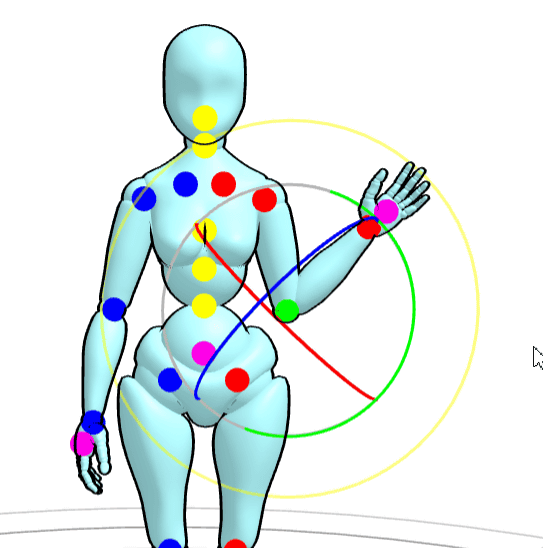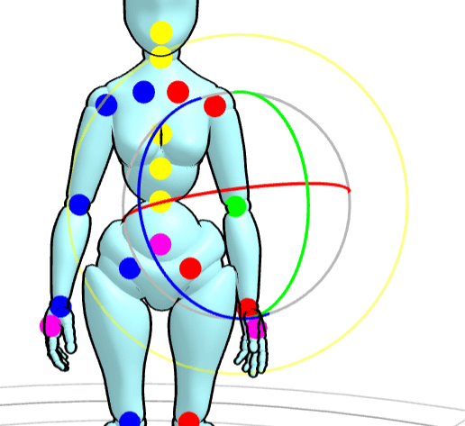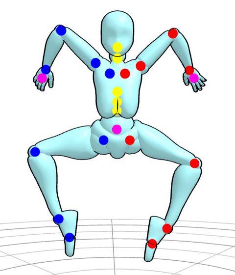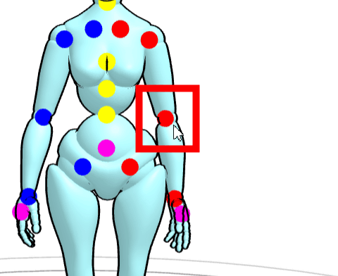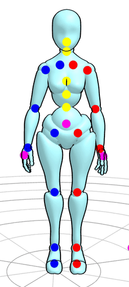 すると、3Dモデルの稼働可能な関節部分に赤青黄桃などのドットが表示されます。