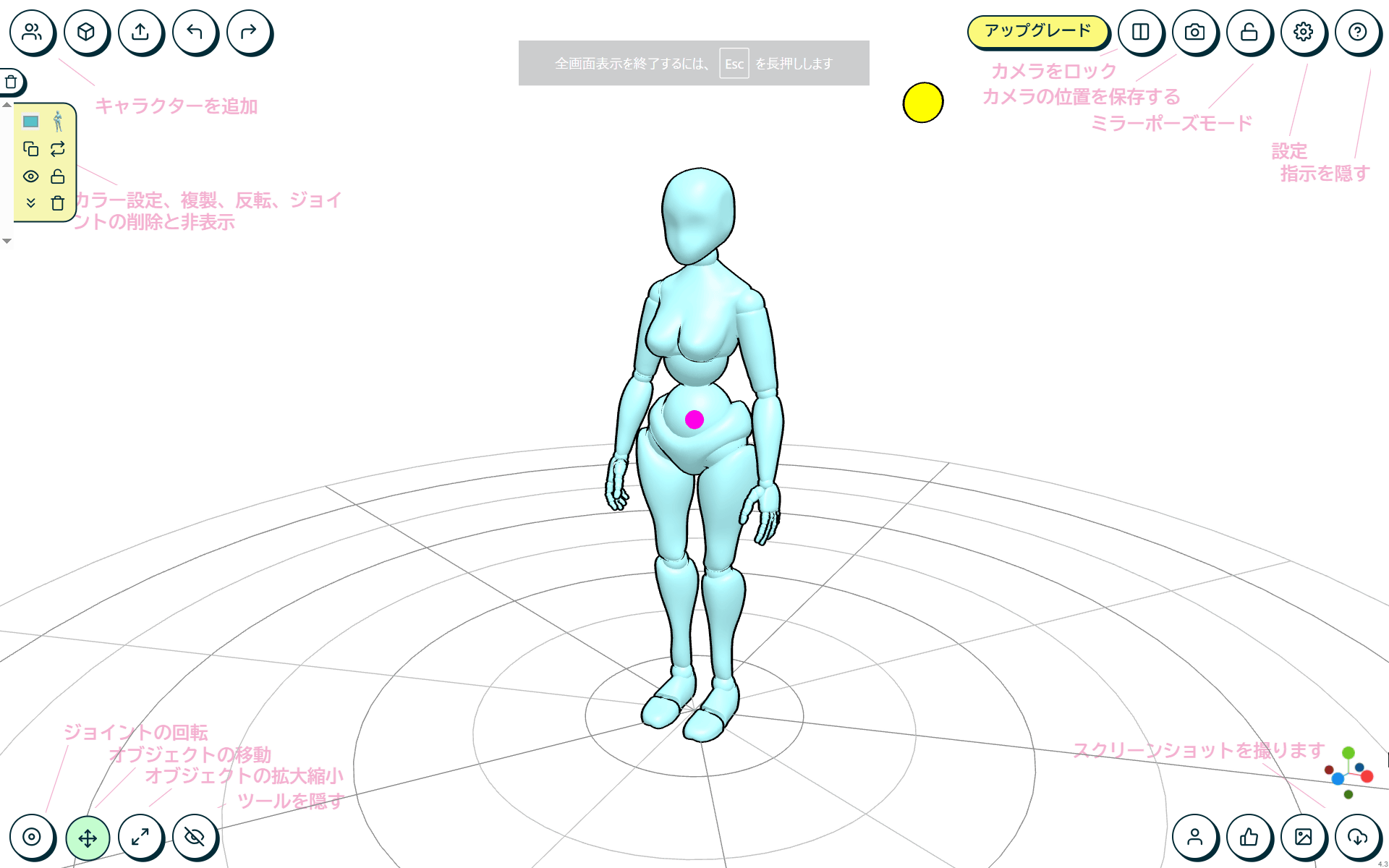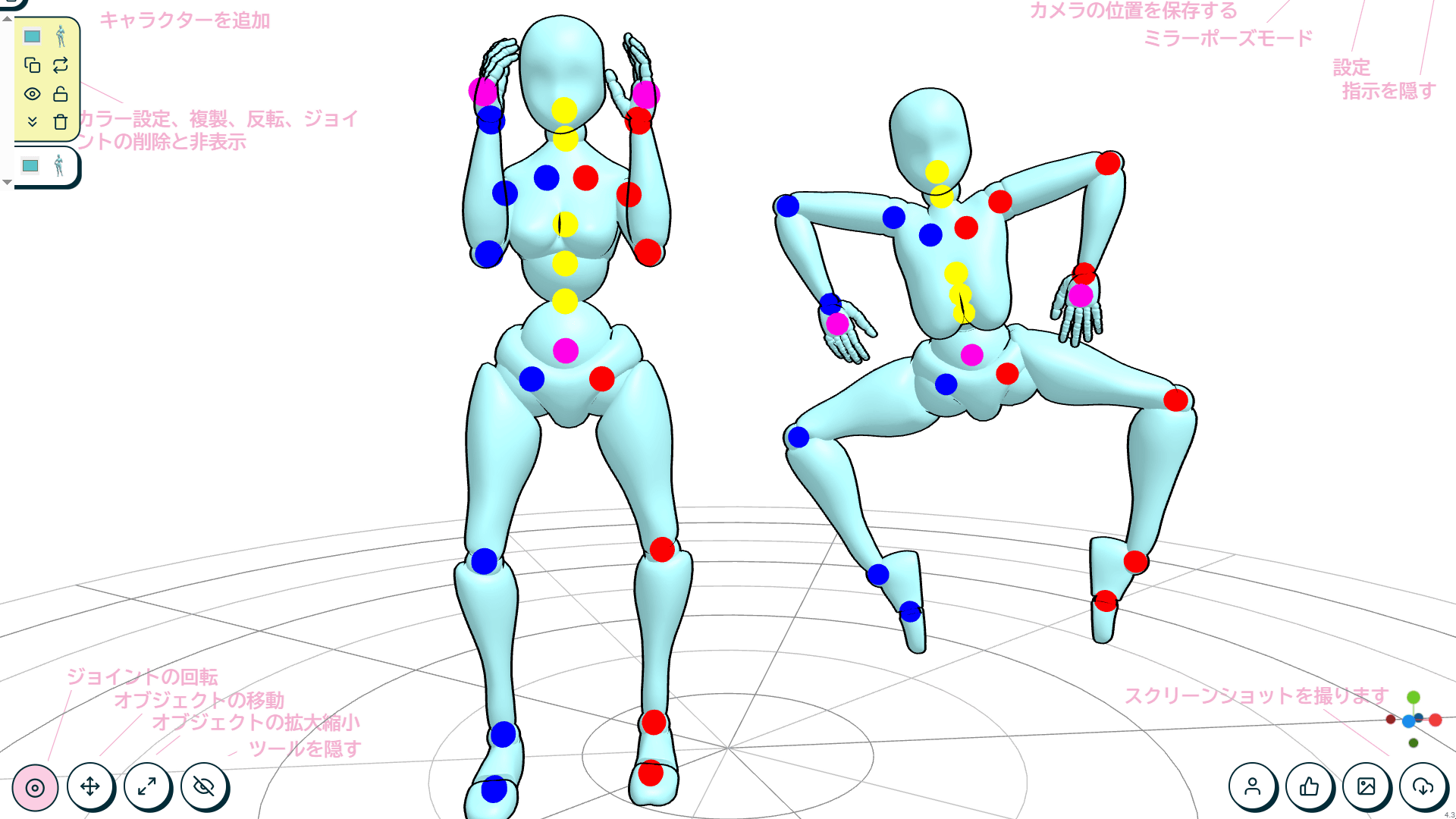 画面左下にある4つのツールは、左から「ジョイントの回転」「オブジェクトの移動」「オブジェクトの拡大縮小」「ツールを隠す」です。3Dモデルのポージングを変更するには、「ジョイントの回転」をクリック。