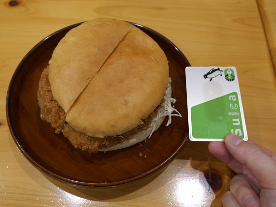 ドデカメンチバーガーを上から見ると、ただでさえ大きなバンズからさらに大きなメンチカツがはみ出しています。交通系ICカードと見比べると大きさが分かるはず。