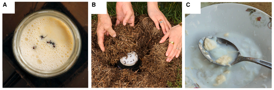 研究チームはまず、ブルガリアの村に伝わる伝統的な手法を再現しました 。温めた牛乳に生きたヨーロッパアカヤマアリを数匹入れ、アリの巣の中に埋めて一晩置くことで、牛乳がヨーグルト状に凝固し、特有の酸味を持つことを確認しました。