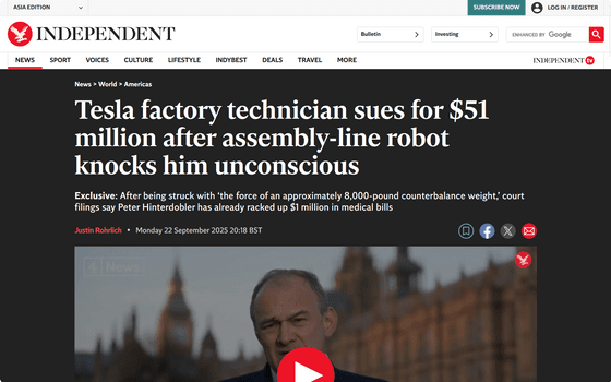 修理中のロボットにふっ飛ばされて意識を失ったテスラ工場の技術者が77億円超えの訴訟を起こす