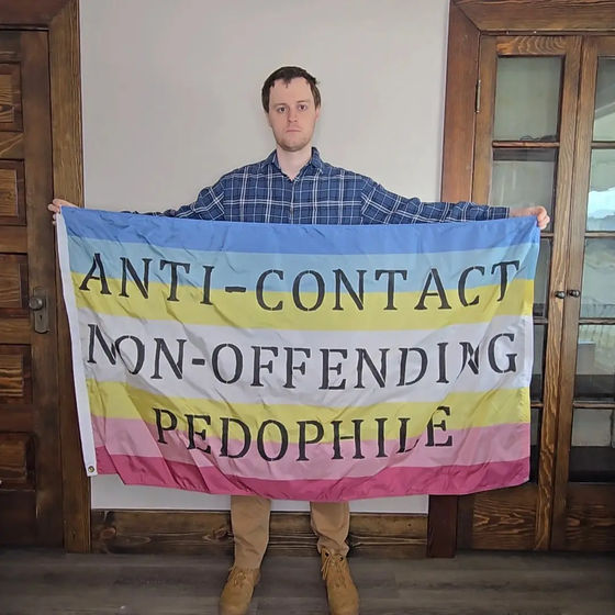 男は首から「接触禁止、非犯罪性小児性愛者」と書かれた旗を身につけており、旗の色はMAPs(未成年者性的指向を持つ人々)が使用する色に似ていたとのことです。接触禁止、非犯罪性小児性愛者とは、「子どもに性的関心を抱いているものの、子どもと性的接触を持ったことも、違法な児童性的搾取資料にアクセスしたこともない人々」を指します。