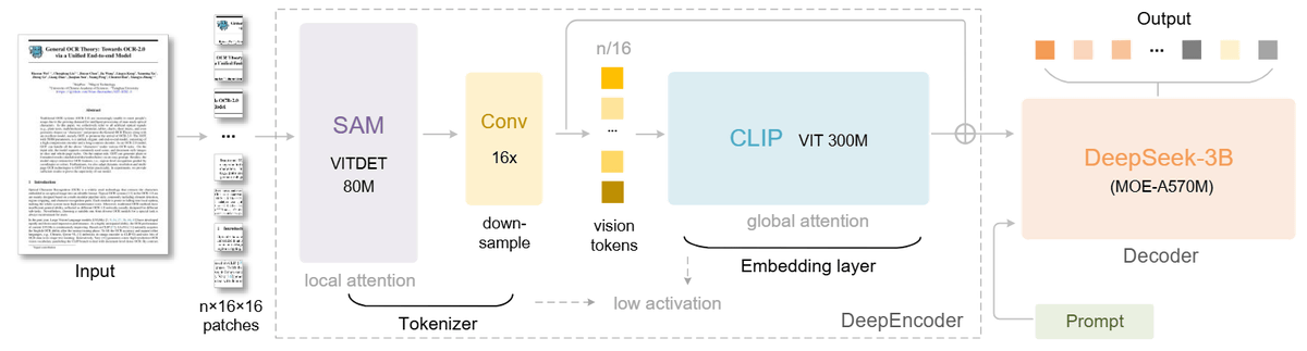 「DeepSeek-OCR」は、名前の通りOCR向けに調整された6.6GBのAIモデルで、元の情報の97%を保持しつつテキスト量を10分の1にまで圧縮することができるとのこと。システム内には、画像処理を担当する3億8000万パラメータのDeepEncoderと、5億7000万のアクティブパラメータを持つDeepSeek3B-MoE上に構築されたテキストジェネレーターの2つのコアを備えています。